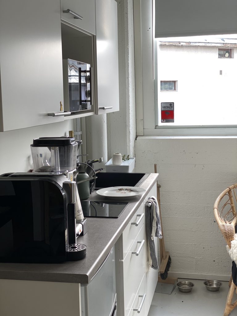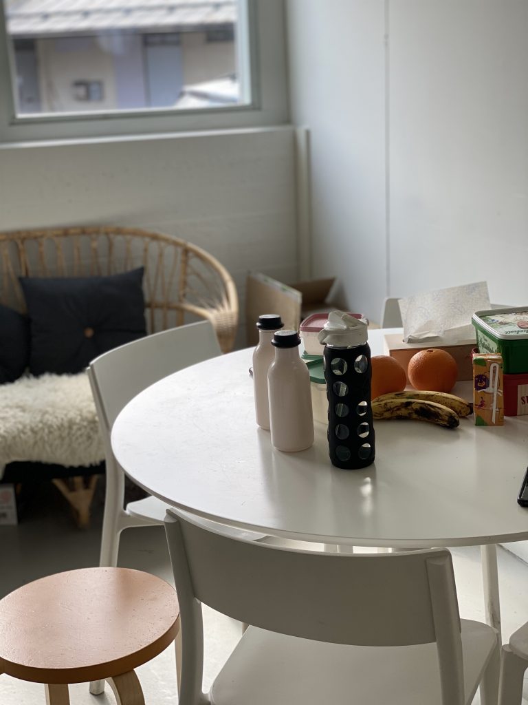 Järjestyksessä seuraavana löytyykin taukotila/keittiö, jossa vietetään taukoja lounasta syöden. Taukotilassa/keittiössä on pyöreä pöytä tuoleineen ja ikkunan alla on pieni rottinki sohva.