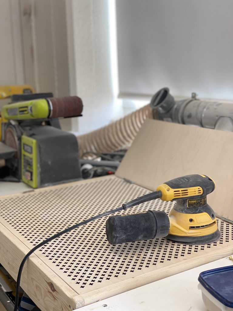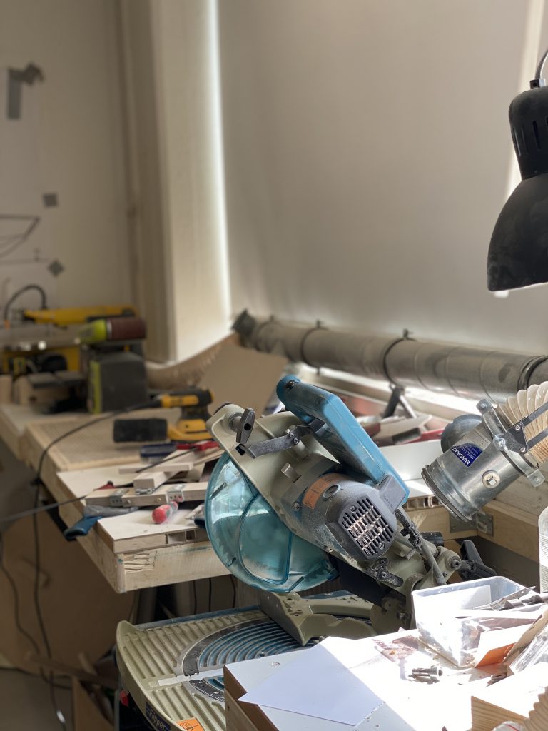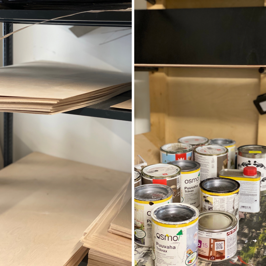 Shopin jälkeen tila jakautuu kahtia. Sen toisella puolella tuotteet viimeistellään (mm. hiotaan, käsitellään, kootaan tai liimataan). Sieltä löytyy pöytätilaa, jossa näitä juttuja pystyy hyvin tekemään. Sen lisäksi on tuotteiden käsittelyä varten oma pöytä ja hyvin säilytystilaa jo valmiille tuotteille.