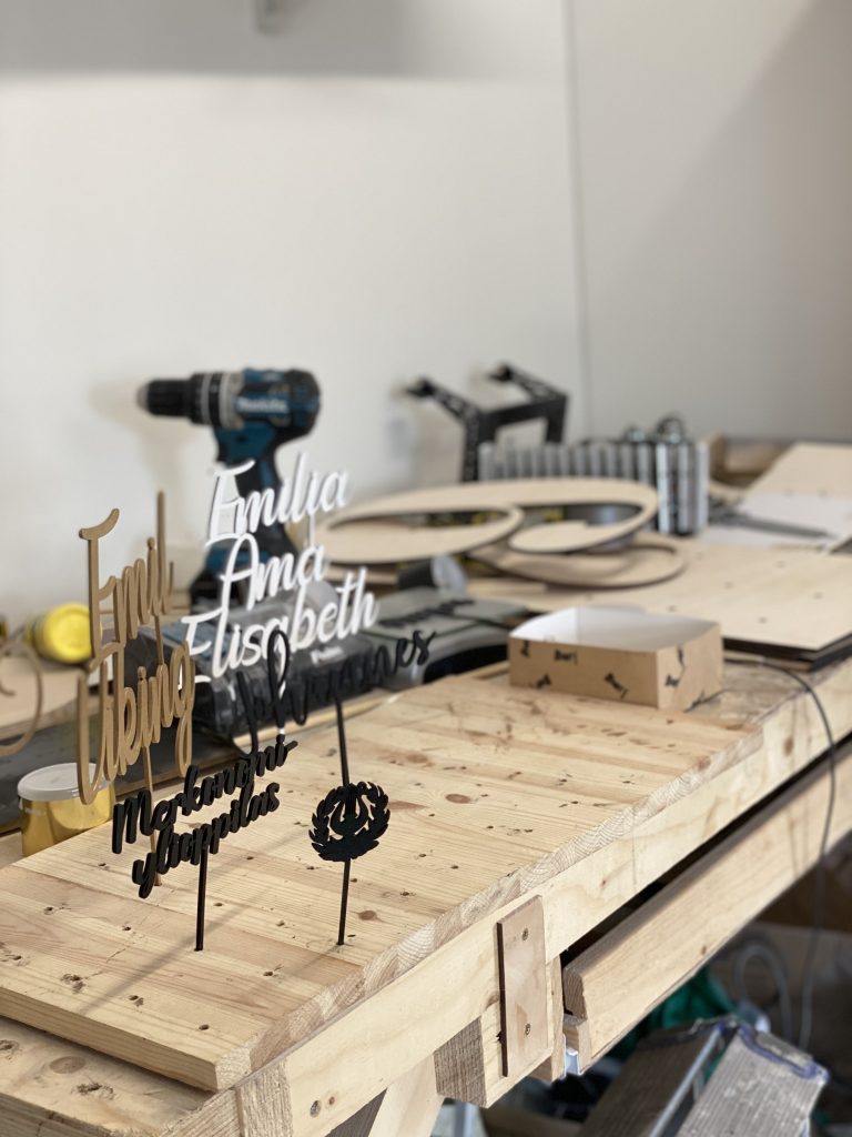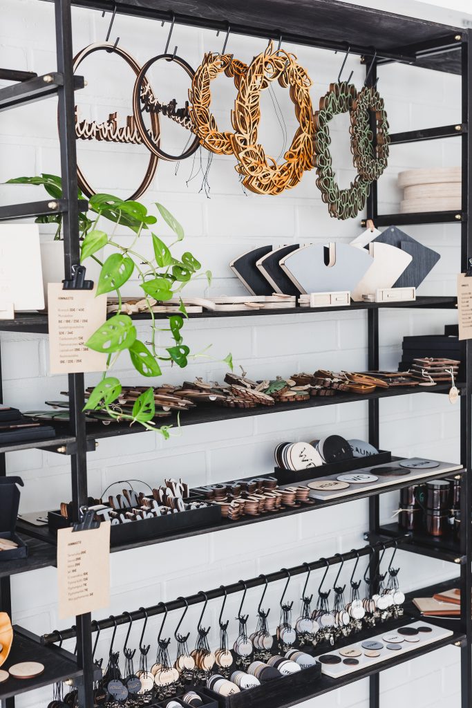 Asiakkaan astuessa sisään shopille, hän näkee pöydillä valmiita tuotteita, jotka on aseteltu kauniisti pöydille. Monet asiakkaat eivät välttämättä edes tiedä, mitä shopin takaa löytyy. Sieltä nimittäin löytyy meidän isot ja viihtyisät työtilat, jossa me päivittäin työskentelemme, uusien tuote ideoiden kehittämisestä, tuotteiden valmistukseen ja kaikkea muuta siltä väliltä.