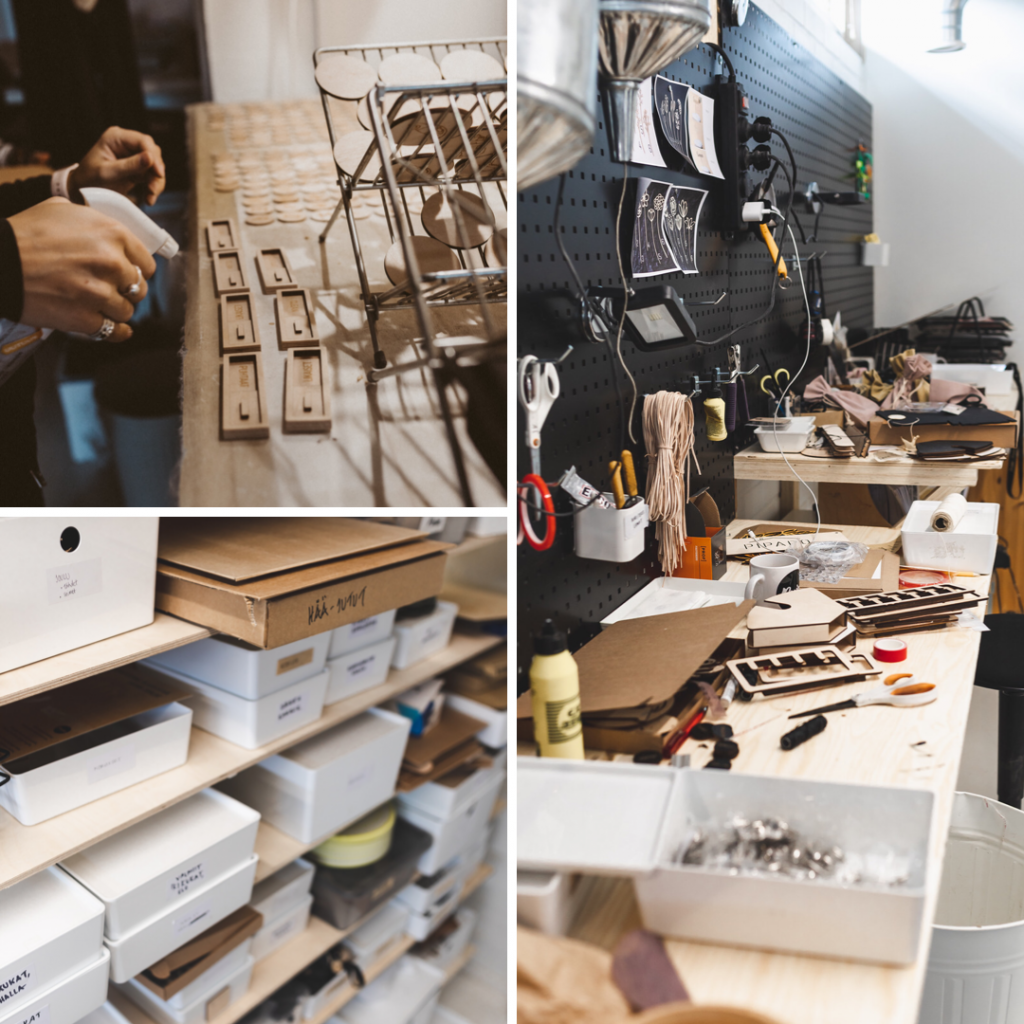 Asiakkaan astuessa sisään shopille, hän näkee pöydillä valmiita tuotteita, jotka on aseteltu kauniisti pöydille. Monet asiakkaat eivät välttämättä edes tiedä, mitä shopin takaa löytyy. Sieltä nimittäin löytyy meidän isot ja viihtyisät työtilat, jossa me päivittäin työskentelemme, uusien tuote ideoiden kehittämisestä, tuotteiden valmistukseen ja kaikkea muuta siltä väliltä.